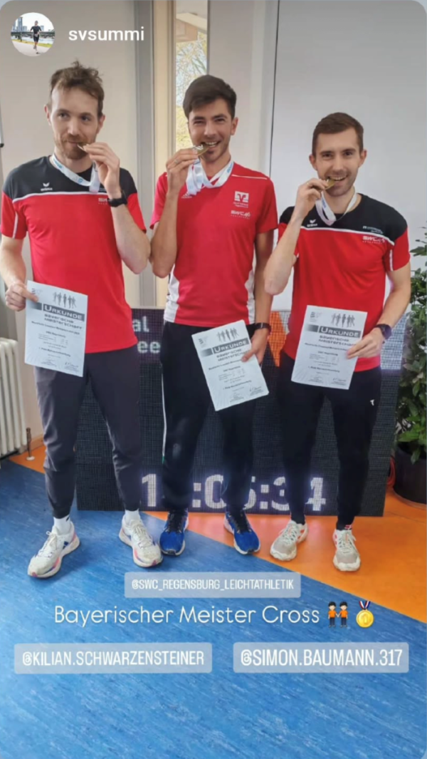 Und die SWC Athleten bedankten sich beim ORGA Team mit zahlreichen Erfolgen: So landete das SWC Männer Mittelstrecke Team mit dem sensationell zu Bronze laufenden Simon Baumann, dem fünftplatzierten Kilian Schwarzensteiner und Marcus Gruber (11.) völlig unerwartet ganz oben auf dem Stockerl vor der LG Telis und dem TSV Penzberg. Michael Lörner belegte Platz 16.