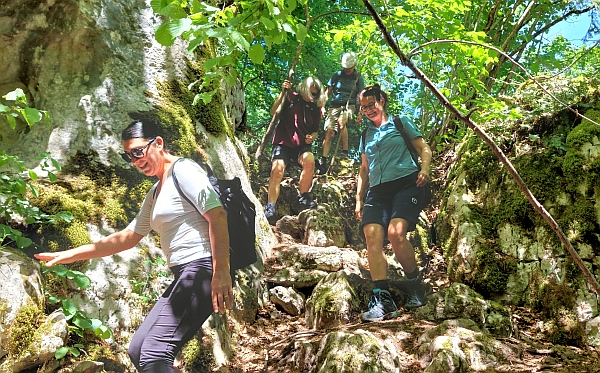 Nach kurzem Pitstop ging es an der Eisdiele in Riedenburg vorbei auf den Höhenwanderweg rechts der Altmühl. Hier im Wald war es schön kühl. Aber wahrscheinlich war es nicht kühl genug, denn wir liefen geradewegs an der Attraktion auf diesem Abschnitt, dem Aussichtspunkt auf Burg Prunn auf der anderen Altmühlseite, vorbei. So klein war der Hinweis auf den Aussichtspunkt doch gar nicht (s. Foto). Na ja, dem Wanderführer fiel es erst auf, als es nicht mehr weiterging. Wir mussten zurück und mit dem zweiten Anlauf ging es hinauf zum Aussichtspunkt - eine grandiose Aussicht belohnte uns. Zur Einkehr ging es dann in den Biergarten gegenüber von Burg Prunn. Weiter ging es auf der linken Altmühlseite Richtung Essing. Dort konnten wir noch von weit oben in den Blautopf spucken.